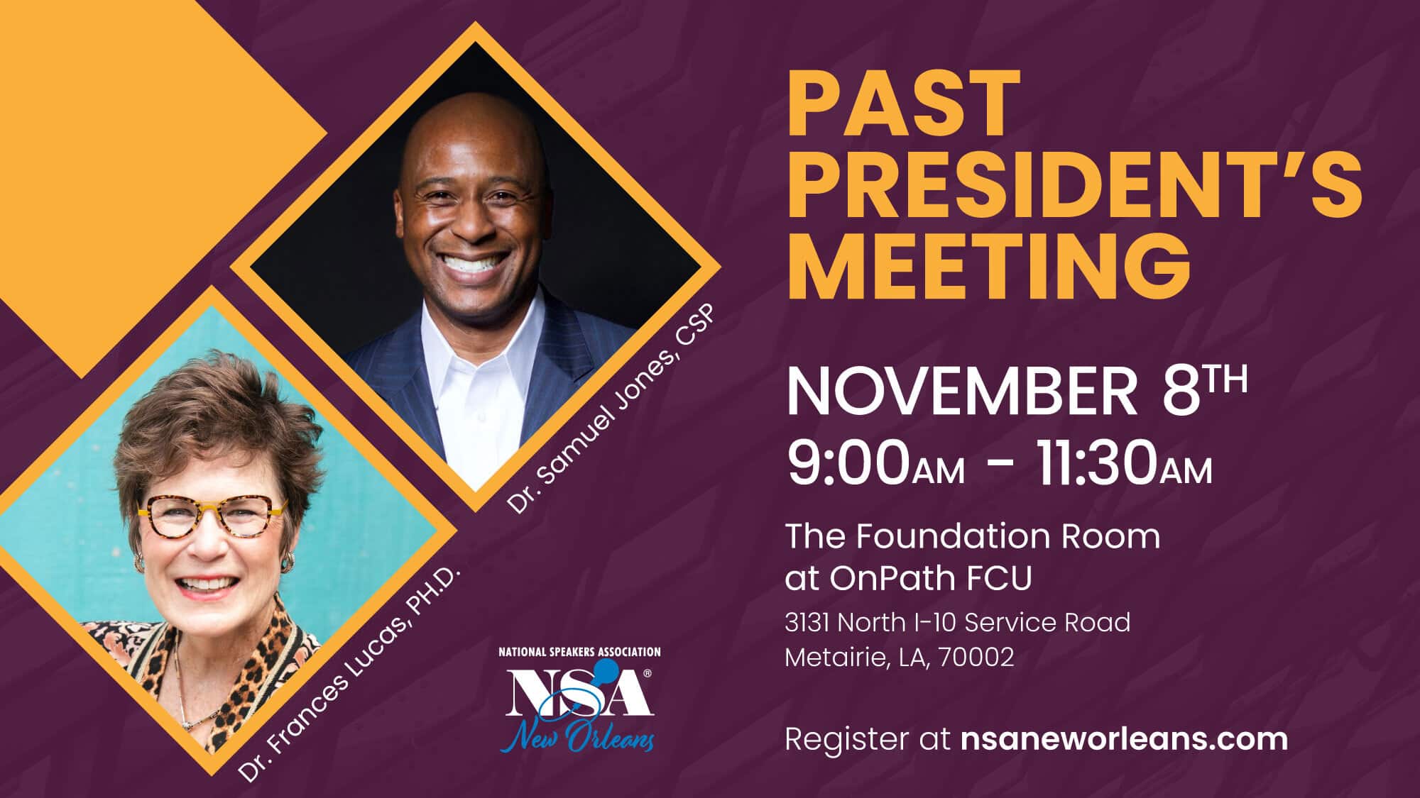 Join us in November for a special NSANO chapter meeting featuring a panel of Past Chapter Presidents, each bringing years of wisdom, expertise, and proven success in the speaking profession. This interactive panel will give attendees the opportunity to ask questions directly and gain insights from leaders who have walked the path of professional speaking at the highest levels. In addition, we are honored to welcome Dr. Samuel Jones, CSP, who will share his expertise and inspiration in a featured keynote presentation you won’t want to miss!